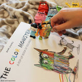 Cet ensemble de 8 figurines du Monstre des couleurs comprend la petite fille et 7 versions différentes du Monstre des couleurs, chacune reflétant une émotion différente : bleu (triste), rouge (en colère), vert (serein), rose (amour), jaune (joie), gris (peur) et multicolore griffonné (confus).